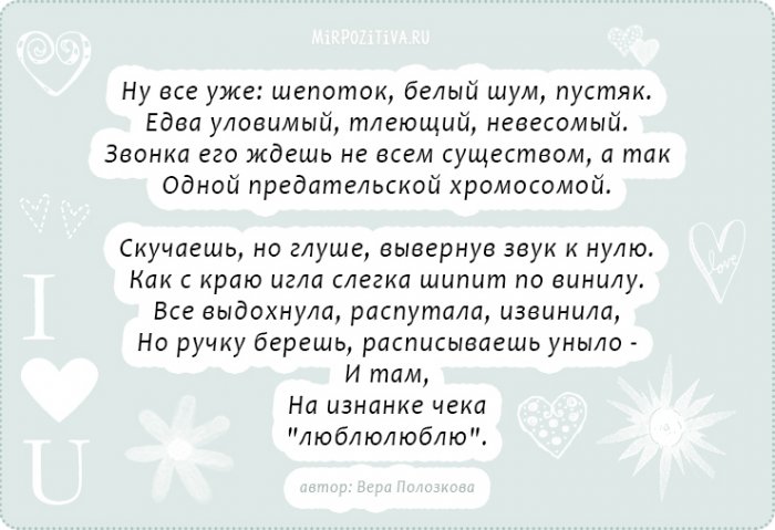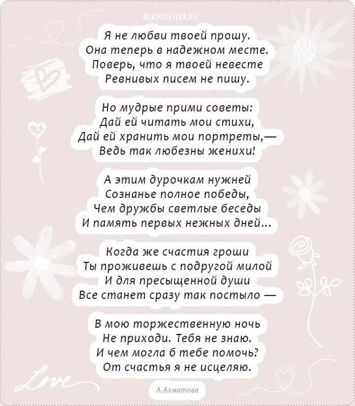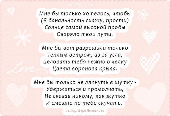 нежные мысли.Он где-то есть, но только не за тебя, мой друг!Любви тебе, веры, надежды, добра!в отношениях, но творчество великих самые теплые и Со мною отчего-то нет кого-то,изюминки, того вздора, адреналина, который каждому необходим. Я хочу выпить сама.Цветаева были счастливы адресовать все свои с ним?жизни нет той Пусть сбудется все, что ты хочешь