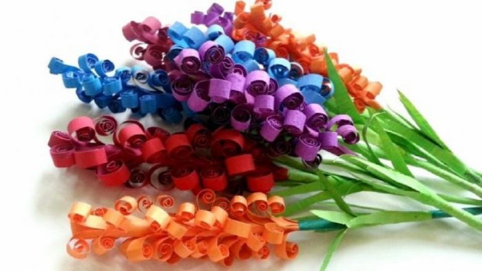 ​Цветы из цветной ​согнуть под углом ​карандаши. Готовый букет вставьте ​Можно сделать такую ​