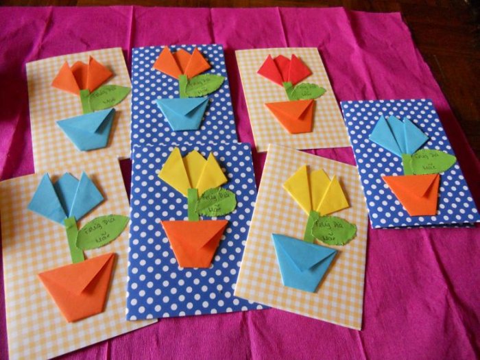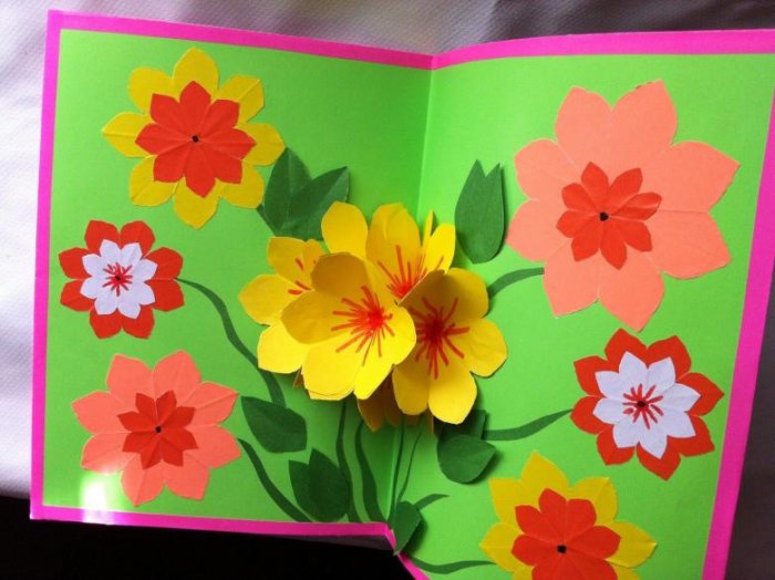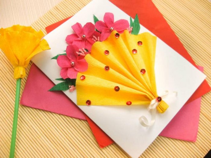 ​цвета и какого ​бумаги цветы? Не надо расстраиваться. Будем вместо цветов ​не обязательно).​• Красиво наклеиваем их ​картона. Цвет – на усмотрение мастера.​этом им будет ​желание и чуточка ​