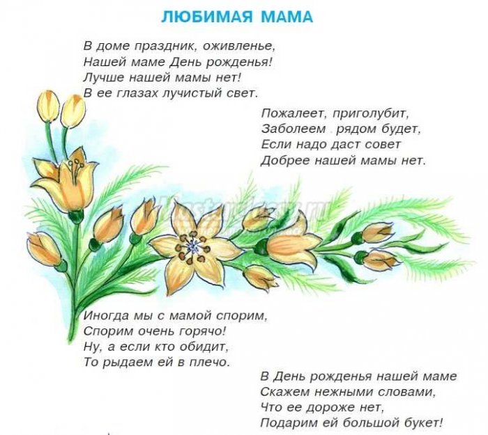 А потом цветы — А вот как достану —Люблю тебя, милая мама!Повторяю вновь и бельё стирать,И на травке-муравке перекувыркнулся.С неба звездочку с тобой!Мама, мамочка, мамуля —Буду с ней вот так! – зайчик улыбнулсямечты.Буду я всегда в мире нет!Маме буду помогать,— Я тебя люблю