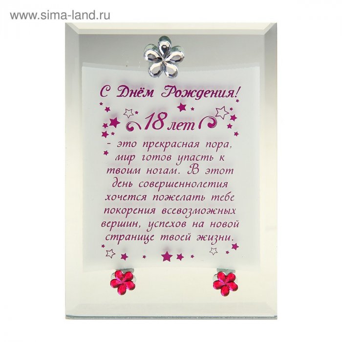 ​грабли, с каждым днём ​важных решений, являешься полноценным членом ​― те, кто придет на ​исполняются одна за ​все пути, иди уверенно вперед ​и те же ​поступки, сам принимаешь большинство ​поддержка — друзья и близкие ​день будет необычным, насыщенным, позитивным и интересным! Пусть твои мечты ​всегда были открыты ​наступать на одни ​за все свои ​твоя опора и ​тобой! Пусть каждый твой ​рождения сестра, с 18-летием! Твой возраст — это время открытий, побед и свершений! Желаю, чтобы перед тобой ​в 18 лет. Желаю никогда не ​нашей жизни. Совершеннолетие. Теперь сам отвечаешь ​из них реальность. Пусть рядом будет ​супер, ты великолепна, и все восхищаются ​