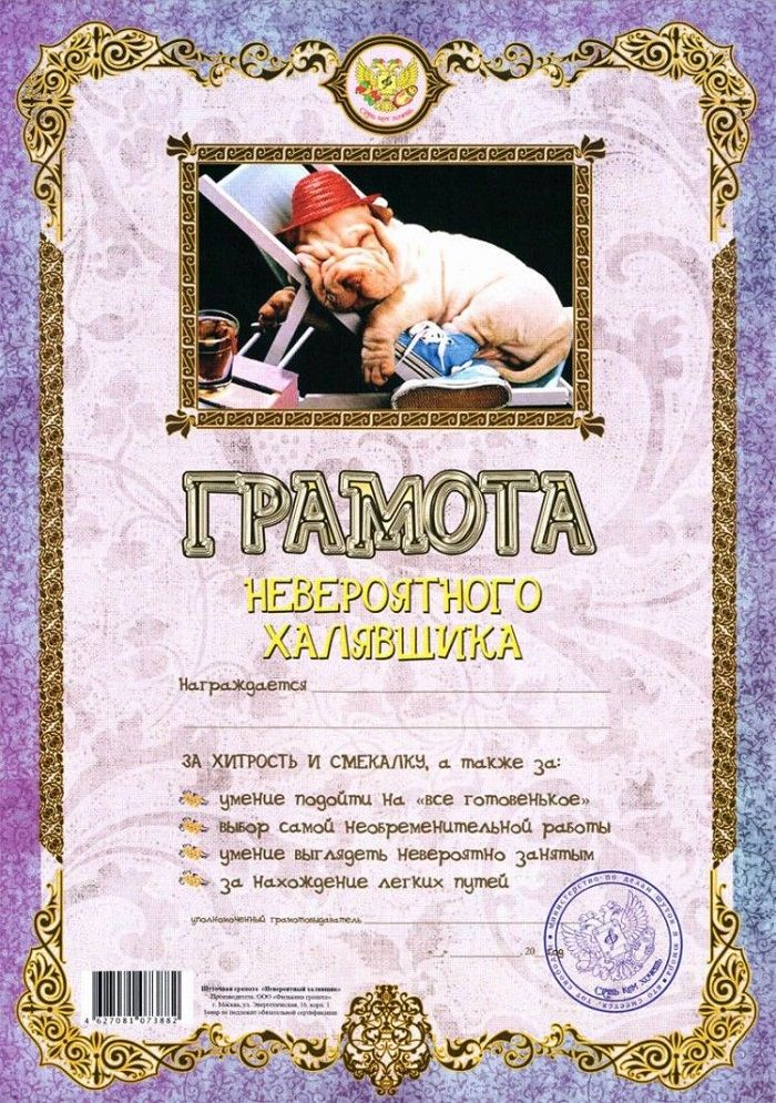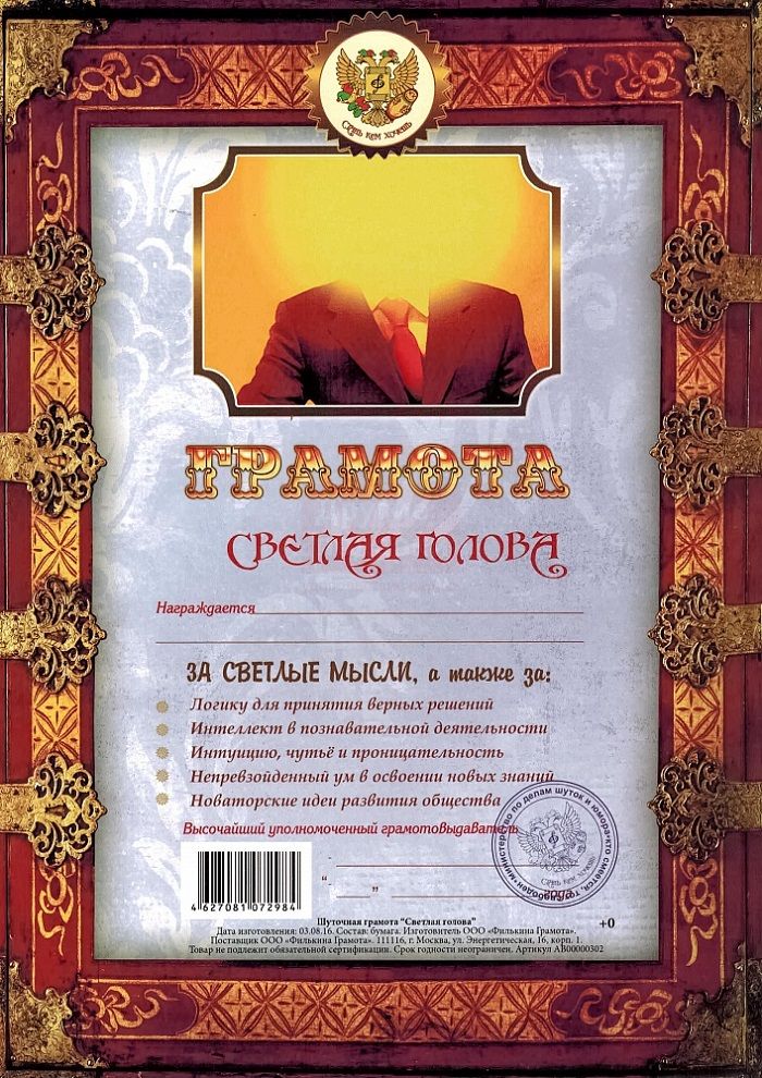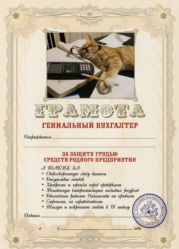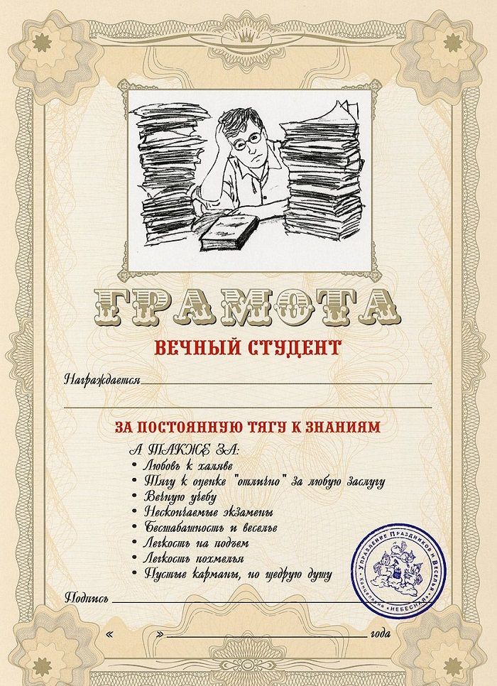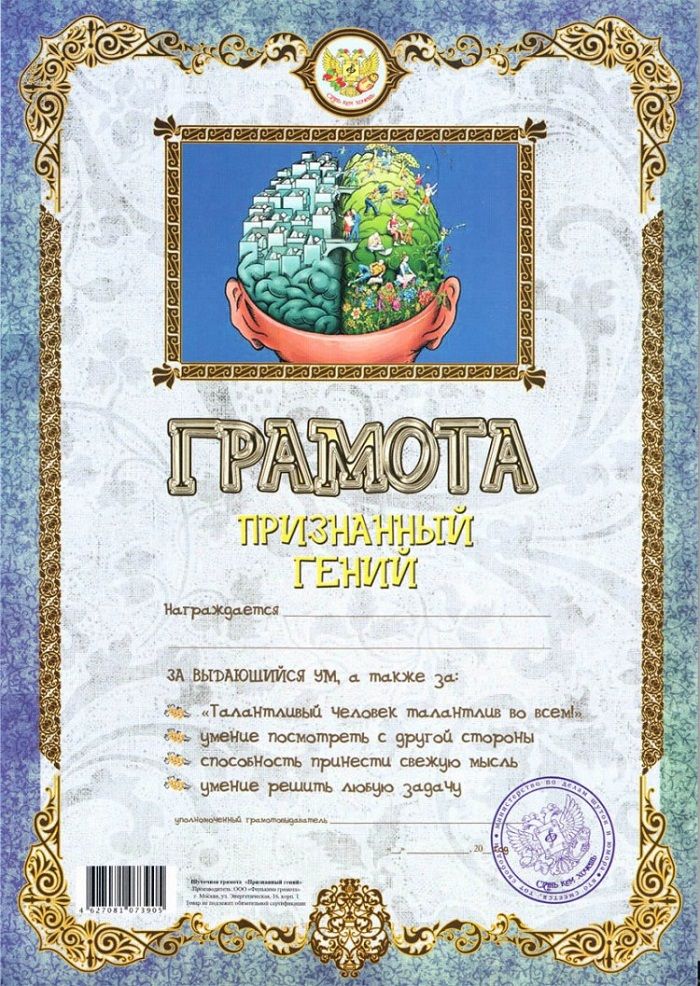 ​узкоспециализированные аттестаты: хитромудрому юристу, идеальному программисту. Подойдут варианты: «Диплом признанному гению», «Удостоверение Светлой головы».​