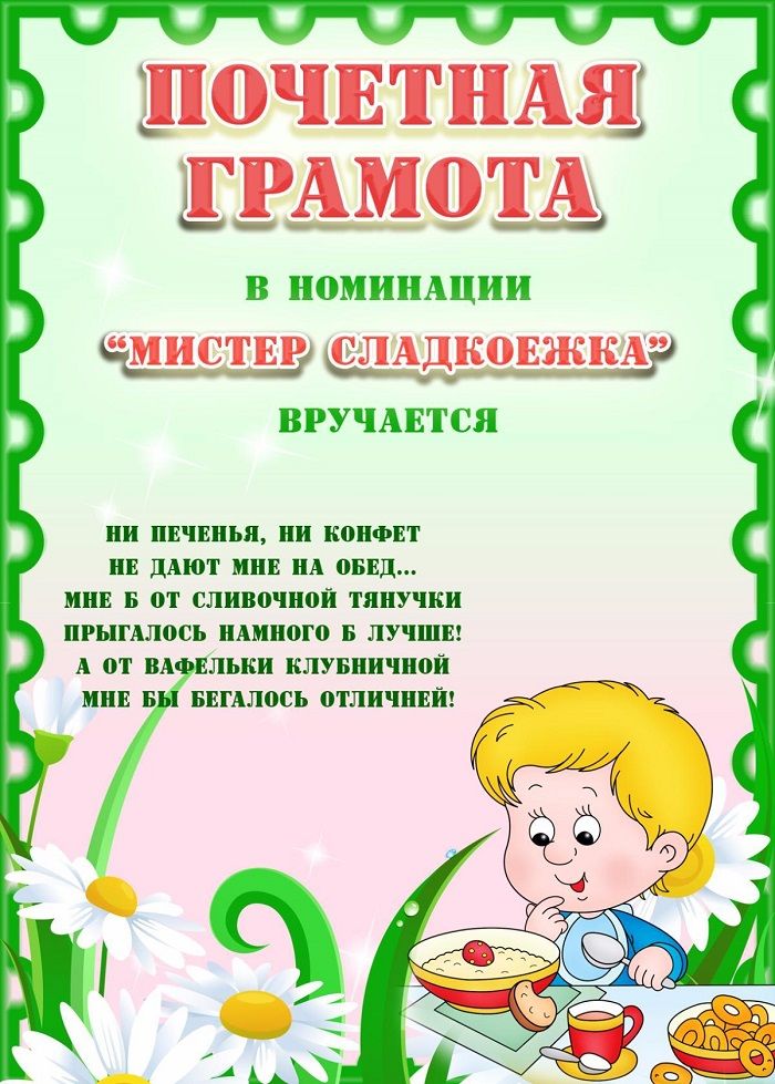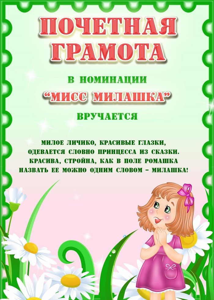 ​учебе», «Примерное поведение». Смешные номинации — «Мисс сладкоежка», «Мисс хохотушка», «Мистер воображение».​