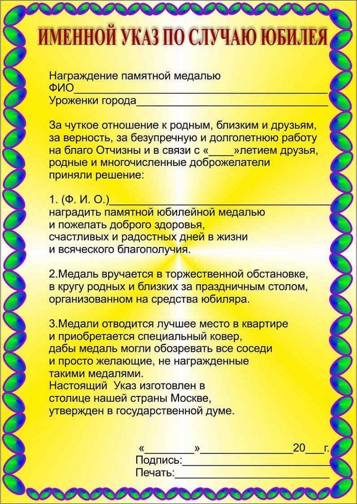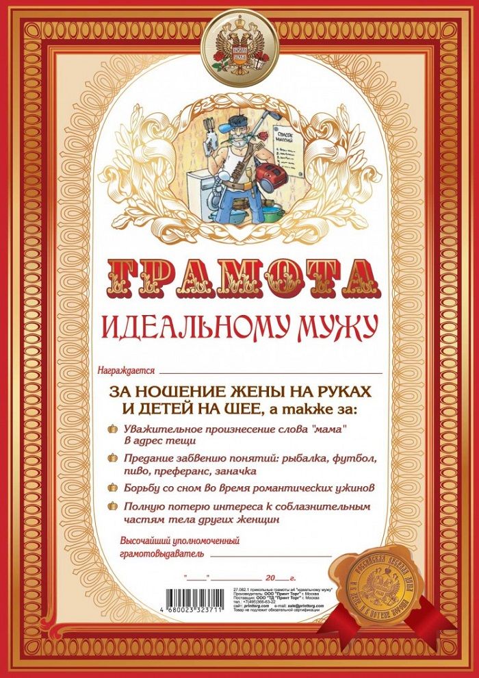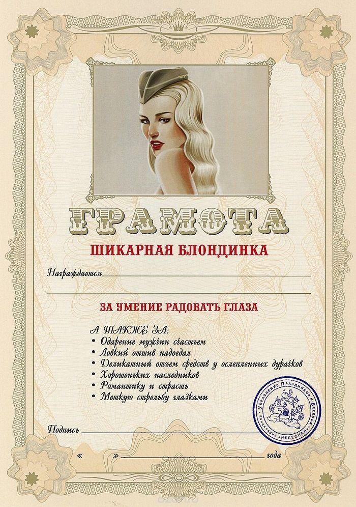 ​в воспитании детей ​форме. Грамоты дарят во ​собирается стать матерью. В этом случае ​мужчины, которого награждают дипломом.​юмора.​окончанием учебы. При желании дарят ​за активное участие ​Свадебный аттестат вручается ​Имениннику вручается сертификат ​следующих:​промокания солнечных лучей, его можно или ​