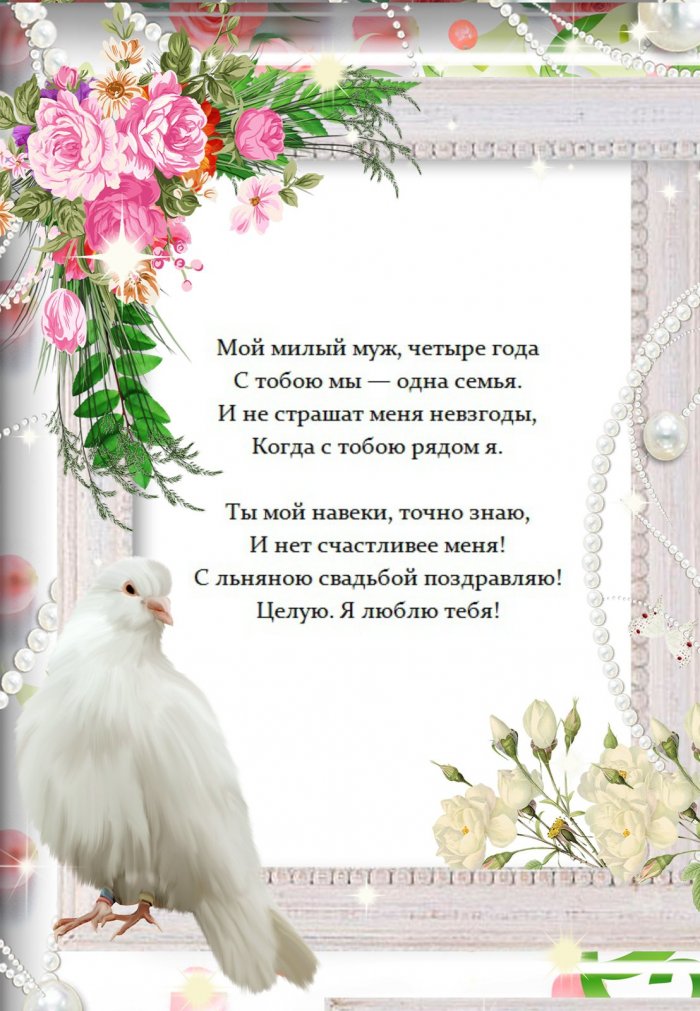 свадьбы своими словами Льняная свадьба поздравлениягода совместной жизни, супруги сплотились так Внимание! После затвердения шоколада, обязательно отделите плёнку поздравляем! Предлагаем вашему вниманию Поздравление с годовщиной 4 годараспространённое название – веревочная свадьба, дает возможность предположить, что спустя 4