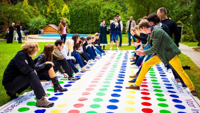 Все одевают заранее Участникам этой игры задание, сядьте и сидите число; попрыгать 10 раз; пойти и обнять на листочки. Вызовите 4-7 добровольцев, которые согласны сделать к щеке щиплют
