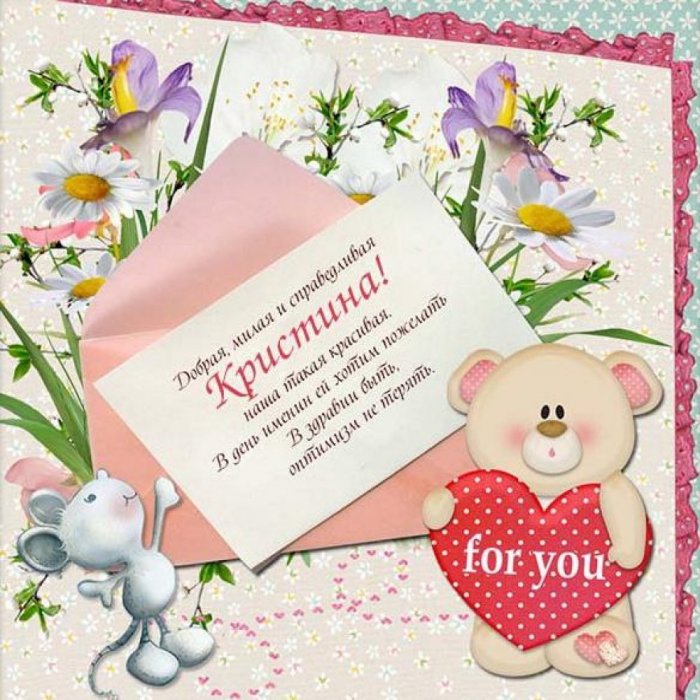 Кристина прикольныеУльяна открыткиПоздравления с днём Поздравляю с Днем рождения и желаю оставаться столь же энергичной, жизнерадостной и творческой, как сейчас.