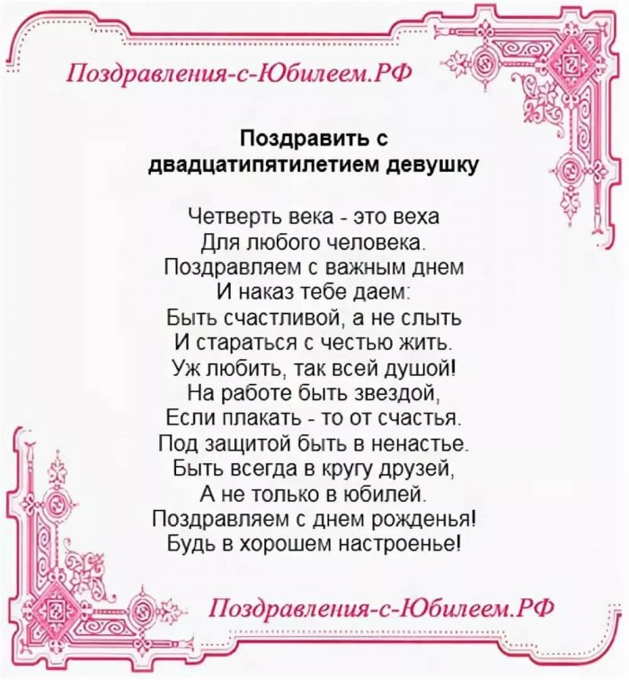 25 летБудь здоровой, вовсе не болей,Мы желаем тебе