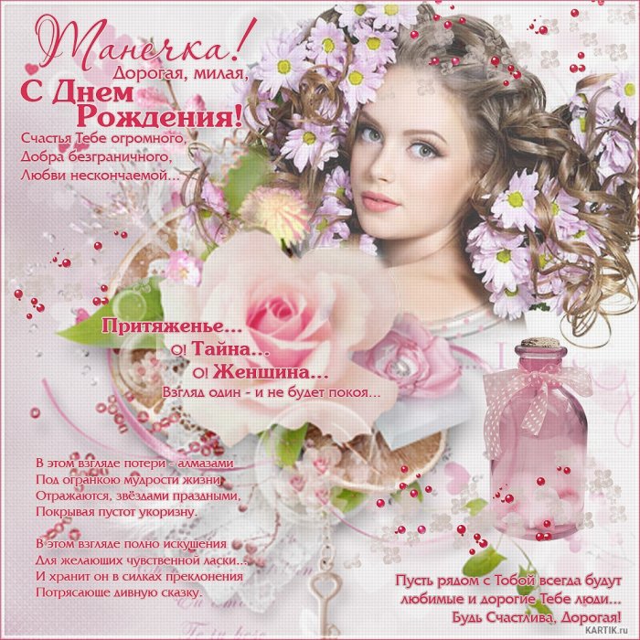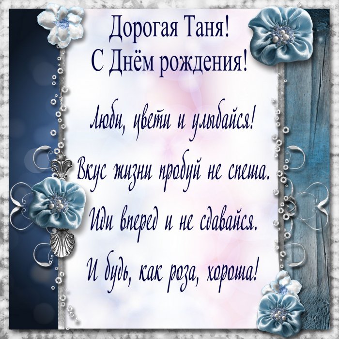 С днем рождения, Танюша! Ты не только красива, но и умна, талантлива и душевно богата. Желаю тебе не только сохранить все свои прекрасные качества, а также приумножить их.