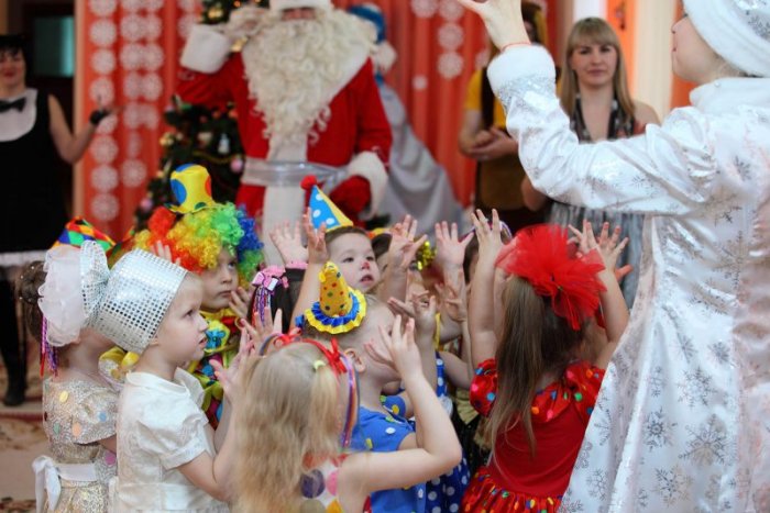с известными персонажами, например, Кощей, Санта-Клаус, Баба Яга, Снеговик и т.д. Дети по очереди