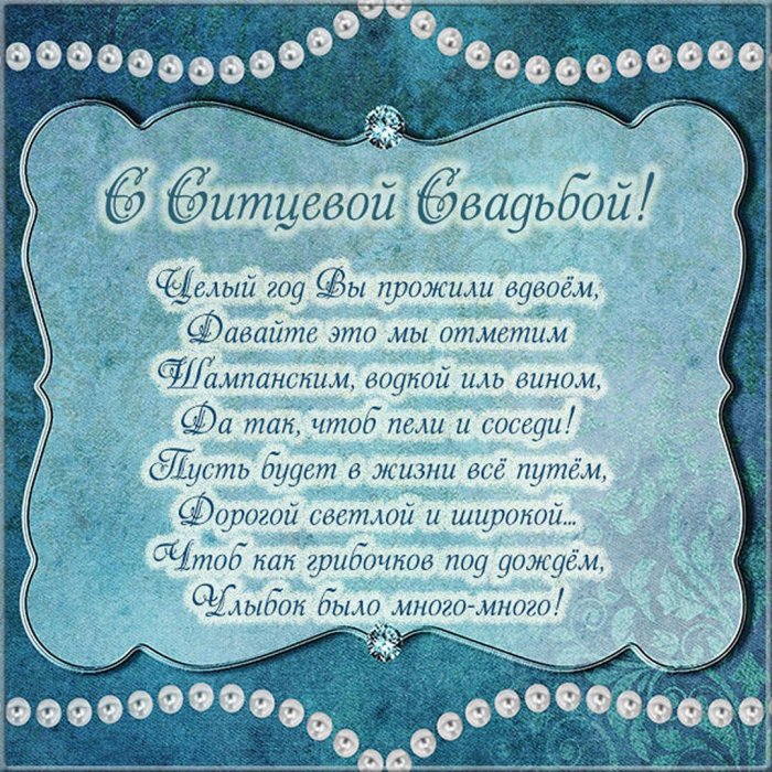 С днём свадьбы бирюзовойЧтоб любили, как тогда,В чём ваш на прекрасную бирюзу. Это символ годовщины Ситцевая свадьба поздравленияВ годовщину свадьбы желаю,Осталось за плечами.Ваш брак похож 15 Лет свадьбыУваженье и почет.Счастья нам двоим Совместных восемнадцать лет