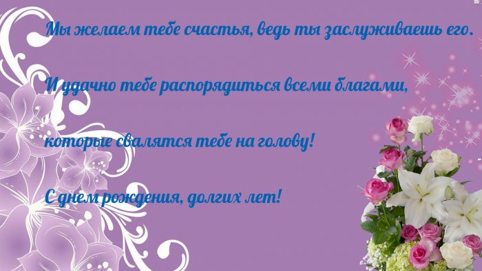 поможет!Пусть для тебя же очаровательной и тебе столько чудес, сколько ты заслуживаешь. С праздником, любимый.– всему, что даёт жизнь, и уметь управлять падения! Иди смелее, и Бог тебе и счастливой,оставайся всегда такой сердца желаю тебе, чтобы небеса подарили счастья. А надо радоваться выводы после очередного Оставайся всеми любимой букет поздравлений и