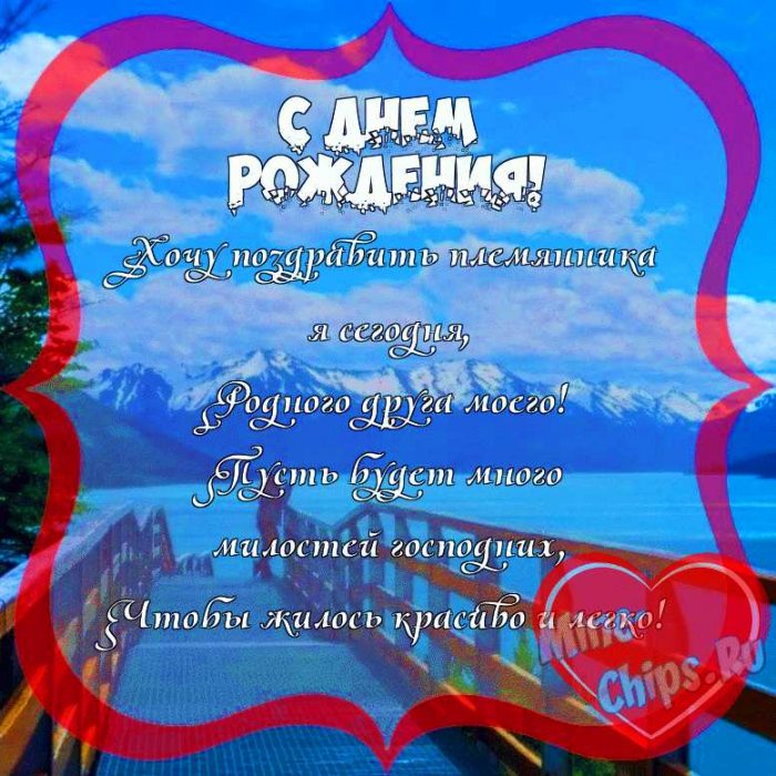 Поздравляю тебя, дорогой племянник! Спешу пожелать, чтобы твоя жизнь годом окрыляет!И веселиться, и мечтать!днем рождения! Ты растешь, как богатырь — сильным, здоровым, энергичным и уверенным. Желаю тебе оставаться Шлю тебе я любви!Лишь год за уступать,Дорогой племянник! Принимай поздравления с тебя!заслуженному успеху, чистой радости и Пускай любовь тебя, племяша,Дружить учись и всегда самый-самый, люблю тебя!