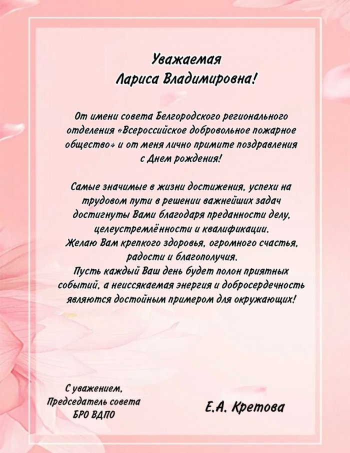 Поздравление председателю совета Чернянского РО ВДПО Притулиной Ларисе Владимировне