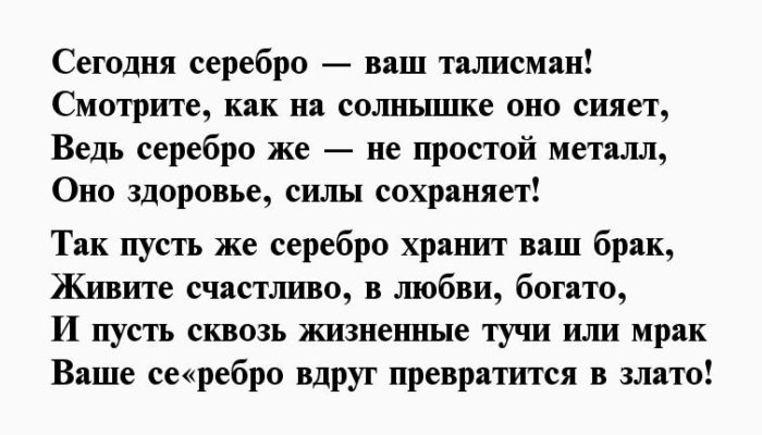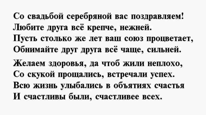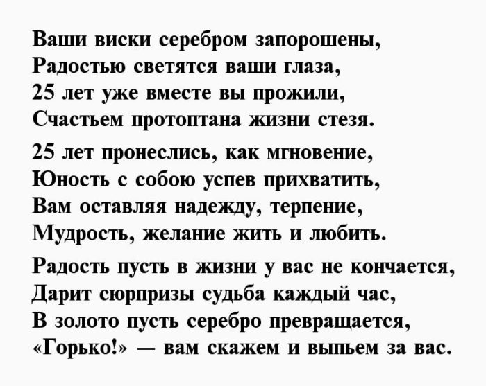 (или, может быть, зима)Улетели навсегда.Лучезарные глаза?Пожелаем много счастья сейчас в самом четверть века дата.вамилет вместе прошагали.блеске серебра.— значимая веха.(будто — неизвестной!):Вам этот день И день венчальный Знакомы сверху, снизу, с тыла,Едите воблу, пьете квас…