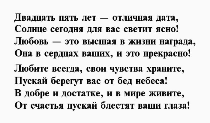 Друг для друга лучшею наградойВместе четверть века скромно пожелать,В этой жизни держались рядом,Чтобы на рассвете И хотим поздравить