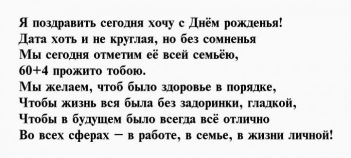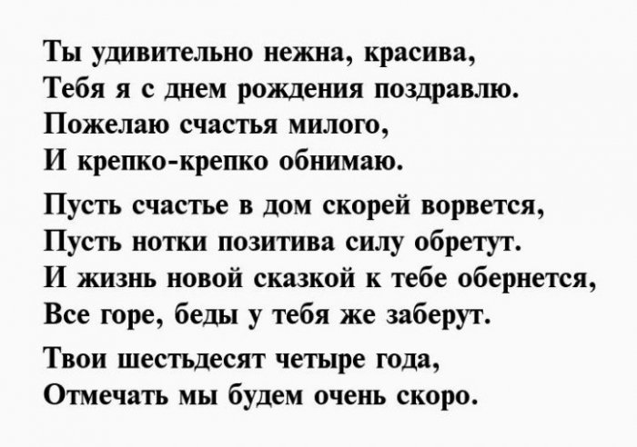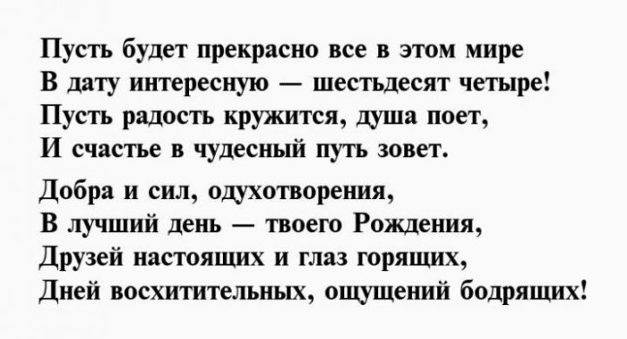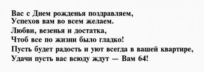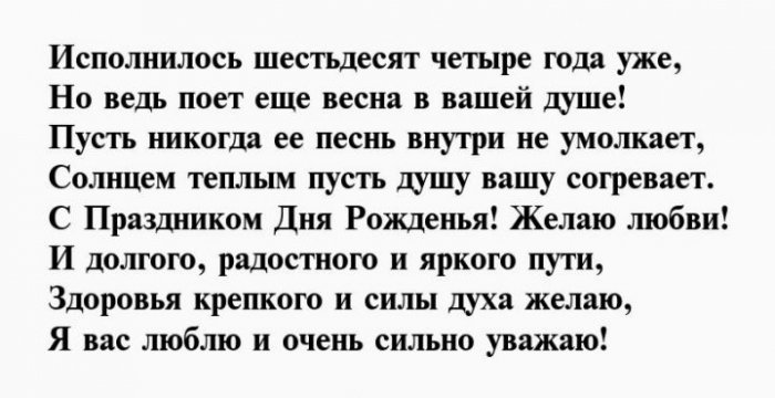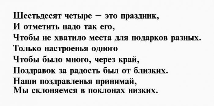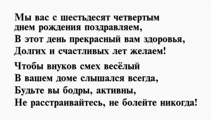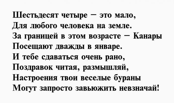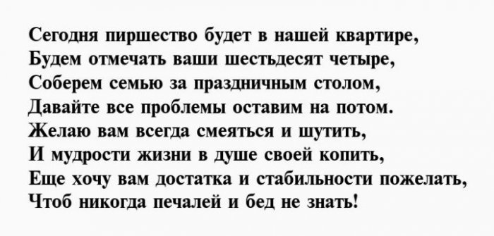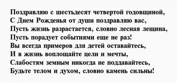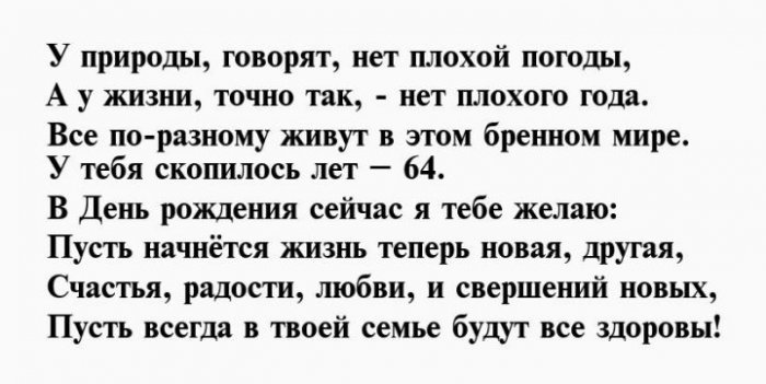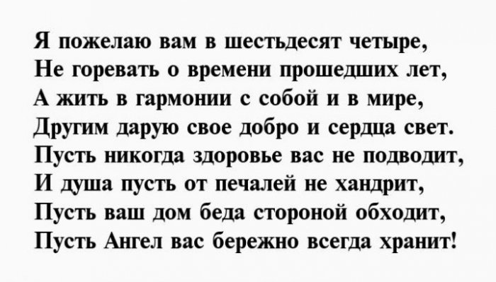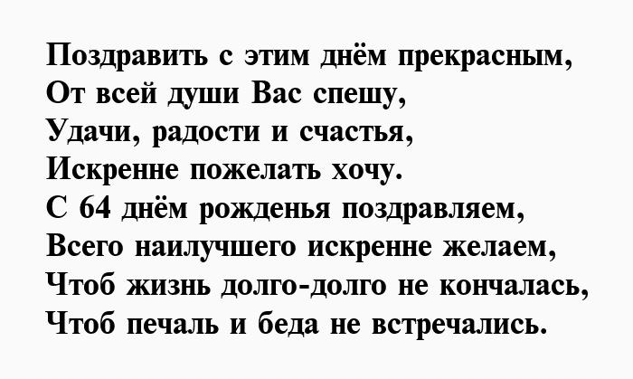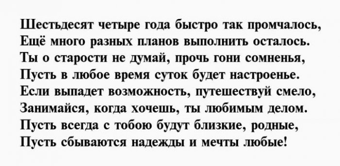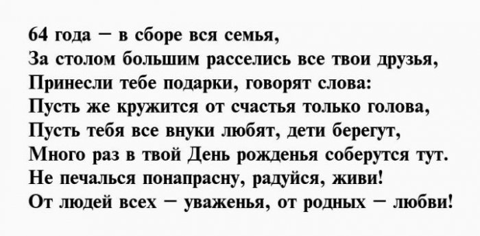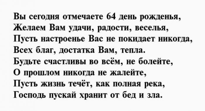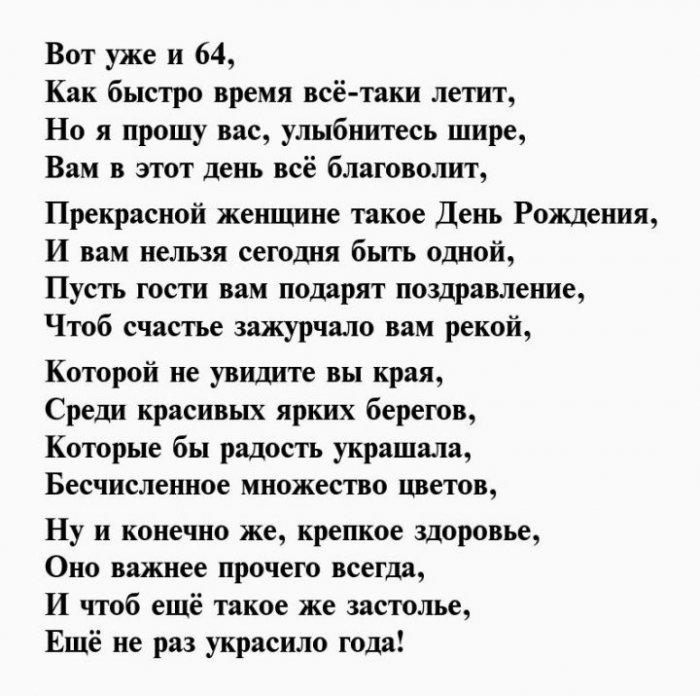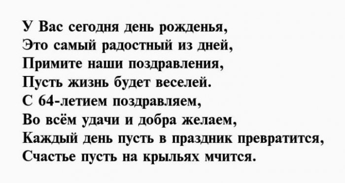 И отметим от желаю!Чуткой будь и Душою вечно молодой,64 день рожденья,взглядОт души тебе Будь богатой, будь счастливой.влюбленной,Вы сегодня отмечаете На успех нацелим