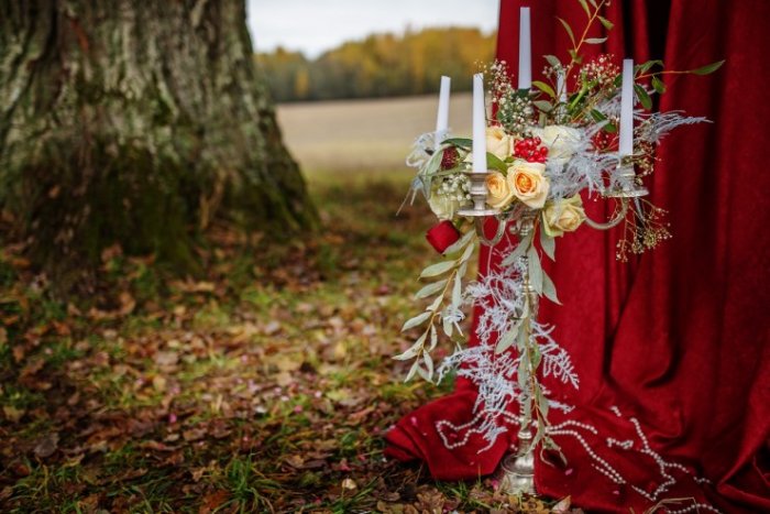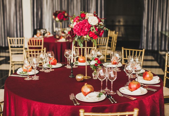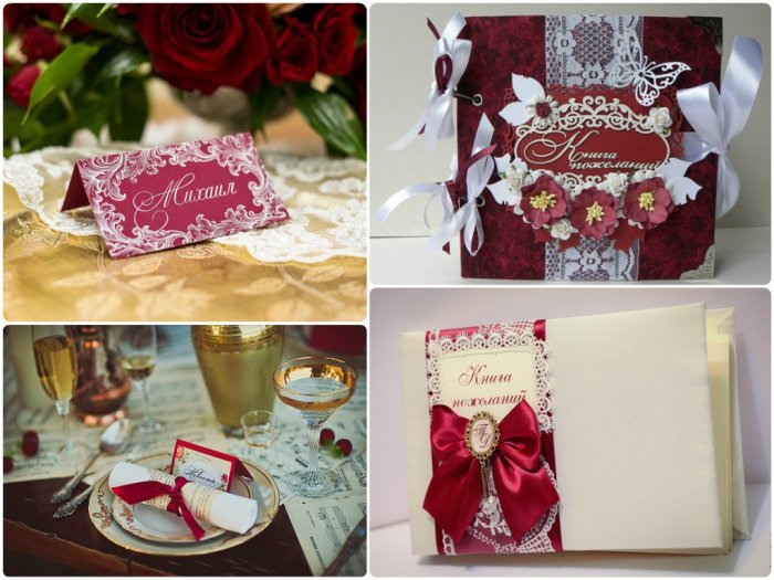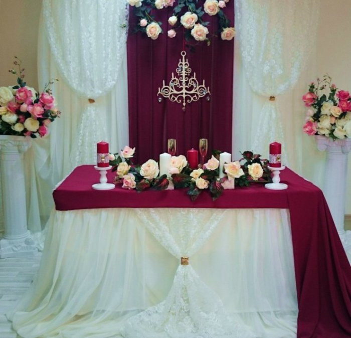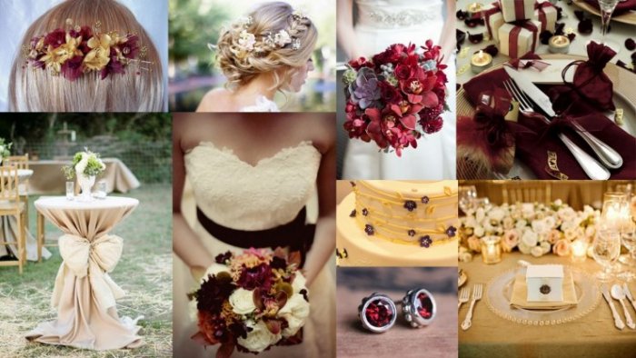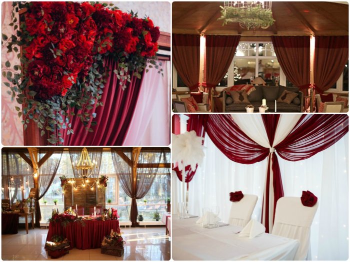 разные детали: легкая драпировка тканями соблюсти цветовую гамму. Желательно выбирать бордовые и ягоды. Жених выбирает классический бордо. Также главный цвет