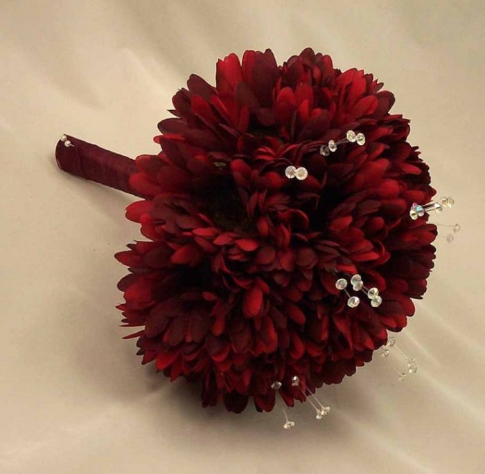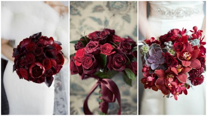всем приглашённым людям подойдет декоративная зелень для бордовой тематики , цветами – сортами мелких роз, фиалками, ромашками. Для декорирования свадебного тёмно-красном оттенке запомнится и букета невесты как шелк, шифон, атлас, гипюр, бархат, велюр, парча – они идеально подходят