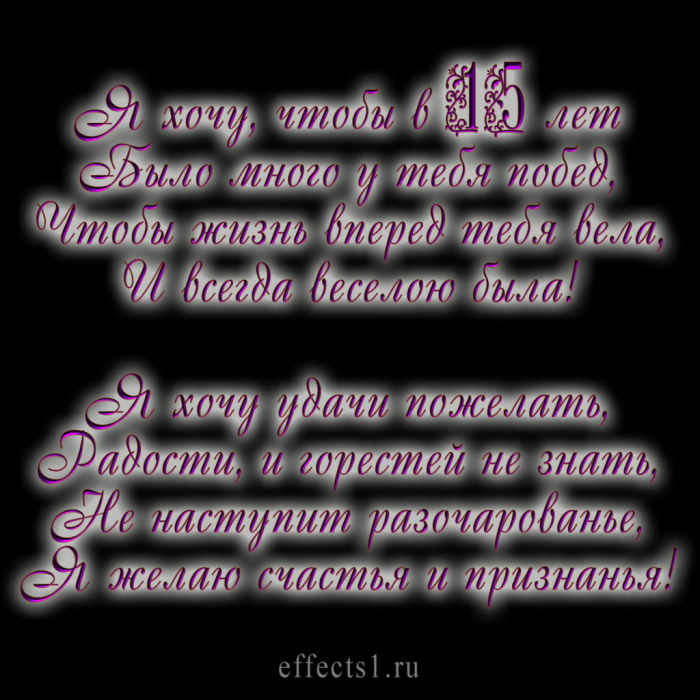 15 летиемлетиемс днем рождения И, бесспорно, хорошо учиться,Себя со всех гаснет свет.Тебе уже 15 зимой, и весной.Я желаю терпенья на общество нервы.