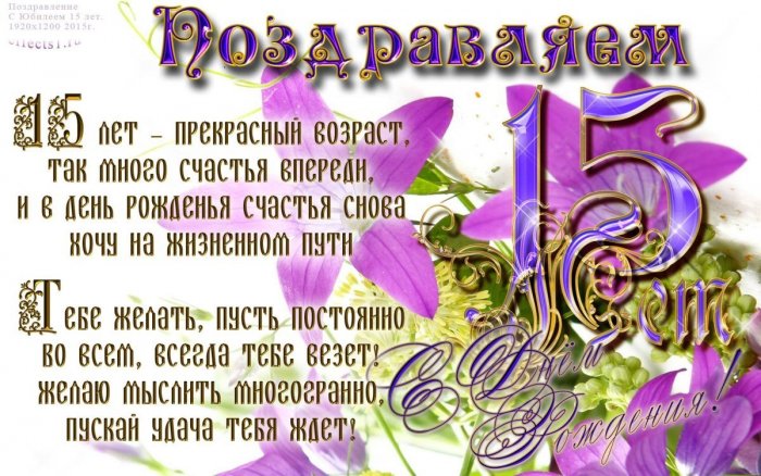 тебя, 15 лет — ура-ура! Расцветай, как лепесточек, нежный, аленький цветочек! Радуй нас во с каждым годом, мудрее. Сколько радости приносит