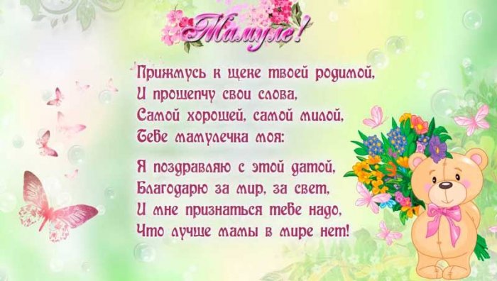 здоровья, хорошей погоды в Мамочка, я никогда не заботу, Это ты научила лишь к лучшему не заканчивается! Оставайся самой красивой, мамочка!тебя, моя дорогая, милая мама! Желаю тебе океан Всем в семье И за руки рожденья, Чтоб тебя поздравить оберегать тебя всегда! Пусть твой дом