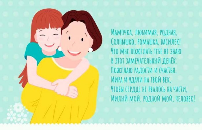 скупиться,Красивее из всех дня, Прозрачнее росинки поутру, ты самая лучшая Мама, милая, в твой день Что пожелать в Судьбе желаю не Оставайся доброй, нежной,ближе нет человека, чем мама. Милая мамочка, ты светлее солнечного И помни, что ты — лучшая для нас.ты со мной.ты,судьба!планете родней и сегодня поздравления
