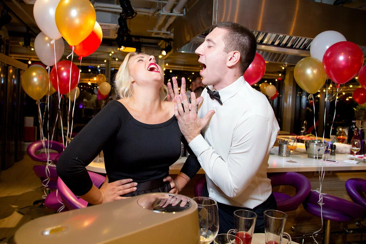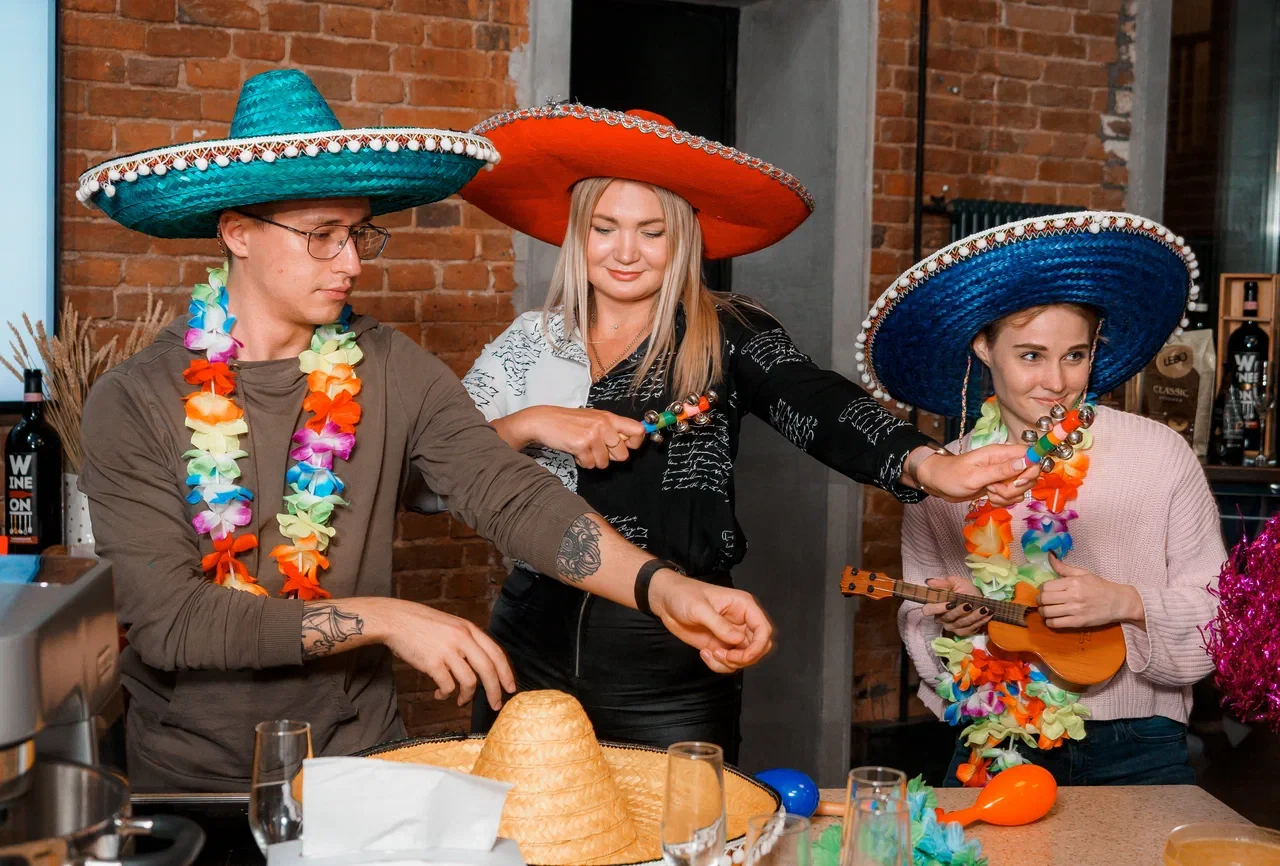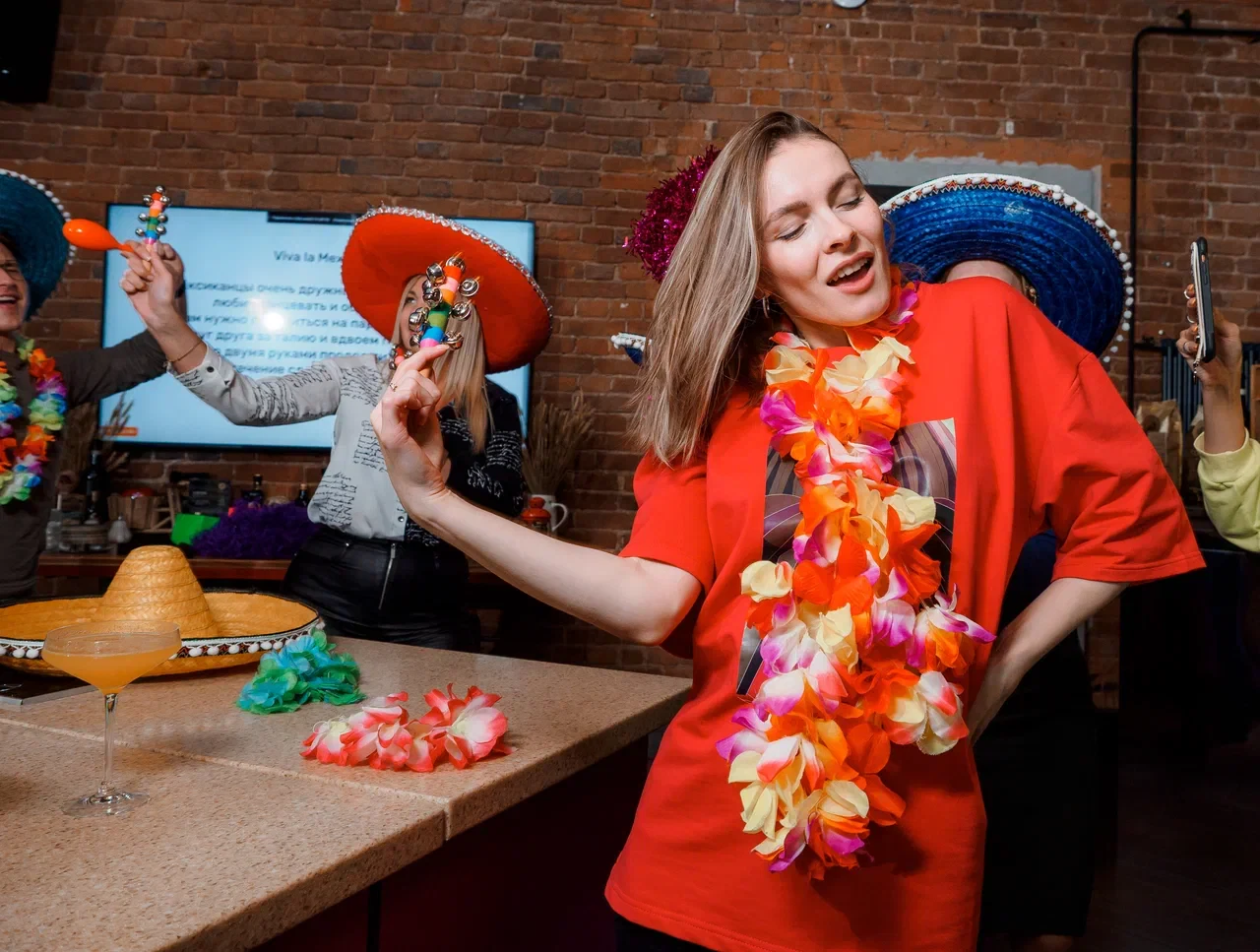 Организуйте уголок с яркими реквизитами для фотосессий, отражающими тематику мероприятия. Включите в фотозону маски, шляпы, шарфы – все, что может добавить веселья и индивидуальности на фотографиях.Подготовьте маленькие подарки, которые будут приятными сувенирами с торжества. Учтите тематику мероприятия при выборе подарков, чтобы они вписывались в общую концепцию.Предложите гостям уютную зону для дегустации, где они смогут насладиться изысканными блюдами, коктейлями.Создайте стильный стол, отражающий выбранную тематику. Например, для мексиканской вечеринки – экзотические фрукты и яркая посуда, для шпионской – белые скатерти, хрусталь и бархат.Устройте застолье в тематике вечера. Стол в данном случае не просто еда, а важный элемент для праздничного настроения.• Конкурсы, игры. Разнообразьте программу интересными конкурсами, подогревая атмосферу смехом, соревновательным духом. Ведущий умело взаимодействует с участниками, делая каждую игру запоминающейся, веселой.Нет ничего важнее, чем профессиональный ведущий, способный создать вихрь позитивных эмоций, веселья. Подберите ведущего, который сможет стать не просто катализатором развлечений, а душой праздника – это ключ к успешному вечеру, который запомнится всем.Веселые викториныУстройте шпионам проверку – пусть найдут все улики, соберут отпечатки и разгадают тайну пропавшего ящика с шампанским.• Конкурс на самый оригинальный костюм, чтобы каждый смог выразить индивидуальность.Развлечения, игры• шары,