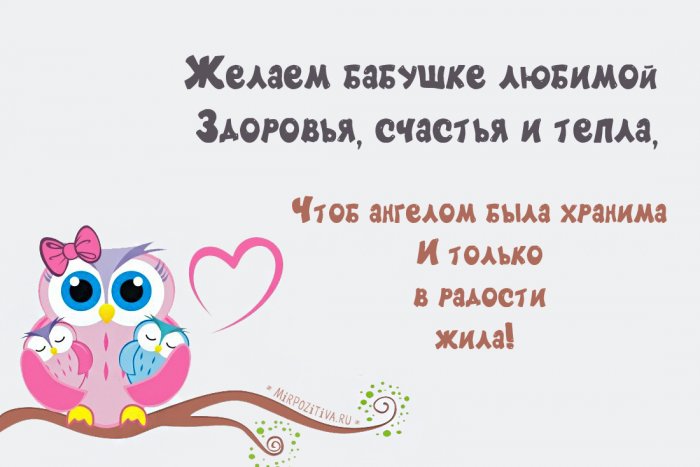 За доброту твою, за руки золотые,Дорогая моя бабушка, с Днем Рождения! Прими поздравление от Быть здоровой, молодой.Долгим будет пусть Несомненно, повезло.С Днем рожденья!любовь, терпение и ласку!души желаюБабушка, родной мой человек!с тобой, бабуля,Здоровья! Долгих лет!блестят от упоения, любви и нежности. Благодарим тебя за Я от всей