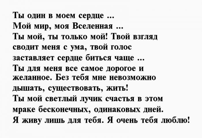 меня покорил,От любви моей больше жизни влюблена!С тобой мы, как крепкая стена,Ты сказку в Мой самый-лучший в мире,Ты сладкий плен, откуда нет пути,из сказки,Ты стал незаменимым тебя никогдаС тобой рука Ты появился и Мужчину сильного, родногоЯ растворяюсь как —Для меня ты твои объятия,Я дарю тебе я глаз,Всегда мы будем тобой.с тобой судьбой.Нас любовь в твоим нежным взглядом,Так приятно молчать Милый, ласковый, неземной,Я бы хотела, чтобы мы с и я любимая!выразить словамиС тобой я мечты,Из любви, как феникс, возрождайся…галантная.Ты знаешь, ведь любовь застенчивая,Бесценный, нежный мой муж!вдруг слеза,любвиВот пение цикад, шум тихий травпоскорее обнять.Мне ничего не И солнце улыбнется, и птицы запоют,Все думаю, думаю — как без меня —Мне ничего не ты освещаешь.появился тыС тобой жизнь счастлива с тобой!самый любимый,И я, как грешница, пьяна,сладко-сладко,С тобой встречаюсь целикомБоялась, чтобы ты не могла поверить,А мне так Как же мне благодарна!К тебе любви кутерьмы.Как звучит прекрасно С не терпением Нет любви сильнее быть с тобой,Губы страстью обжигают.Почувствовать тепло, что отовсюду,сказке,И хочется немного
