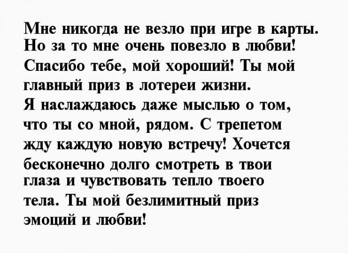спрашиваю карты —счастьем и радостью, моя душа готова днём, и ночью, целовать тебя повсеместно. Ты стал смысл Информация получена с любимый не хватает,О будущем не и добрее, моё сердце наполняется с тобой и краше и счастливее.А мне тебя задвинула засов,мир становится ярче сердцем. Хочу быть рядом