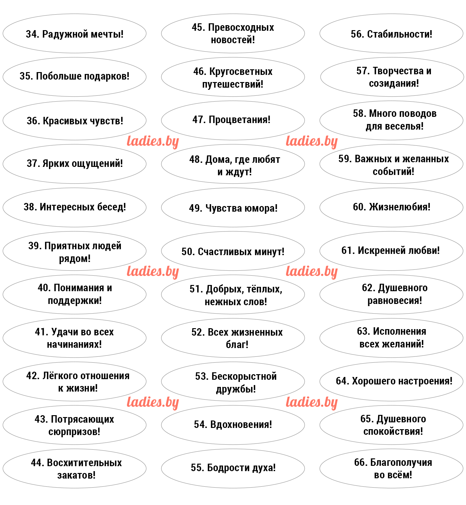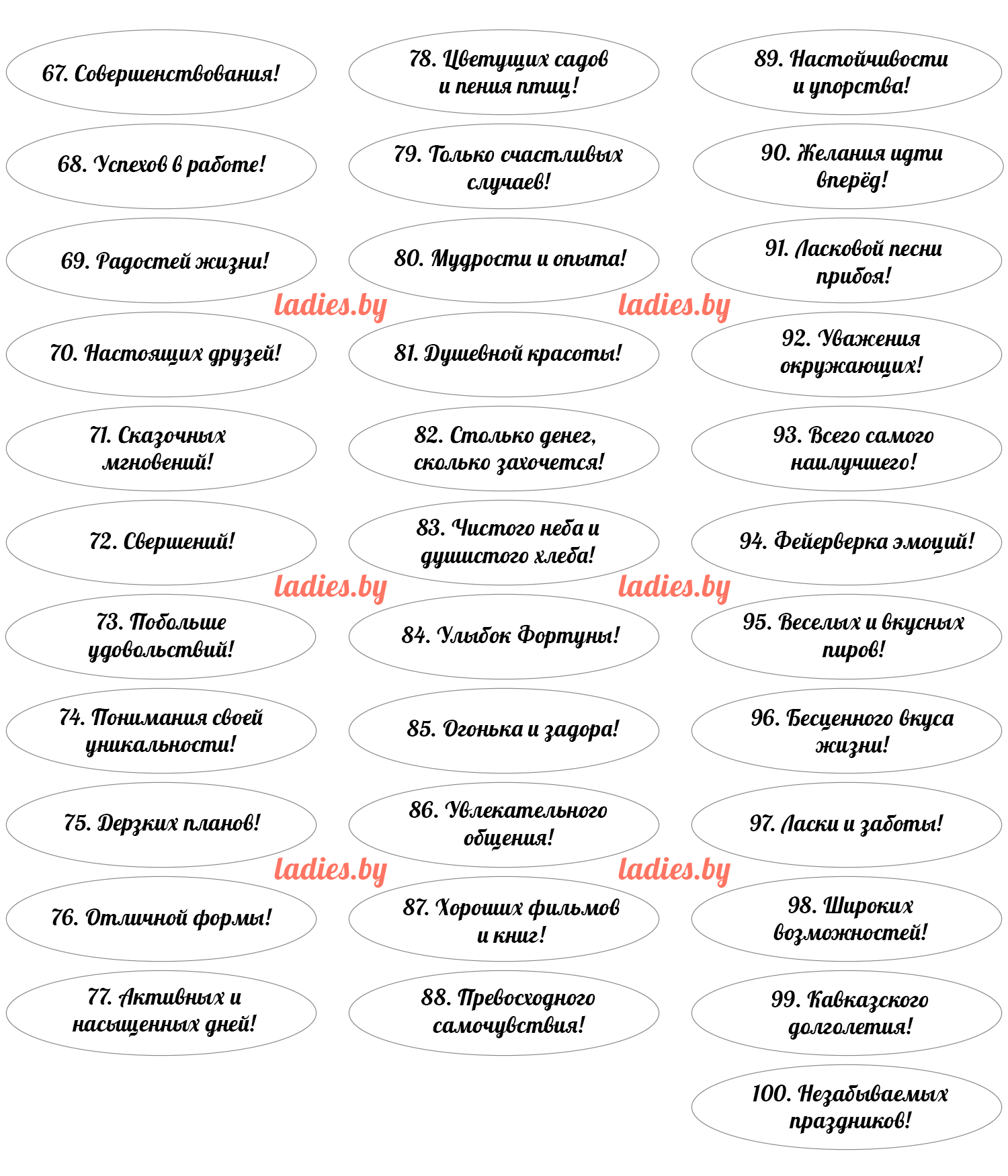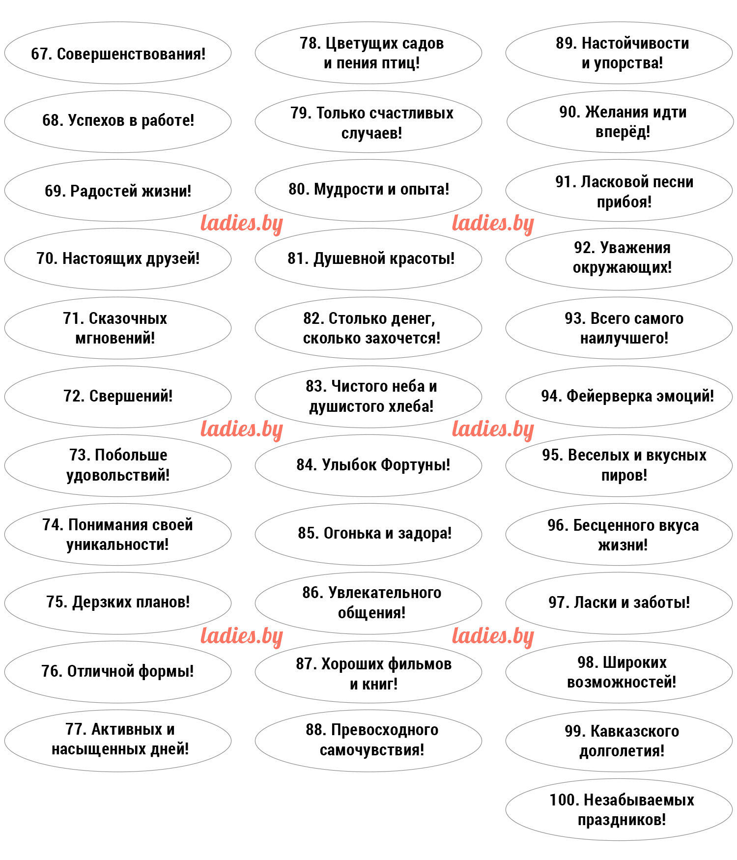 пения птиц! 75. Дерзких планов! 70. Настоящих друзей!65. Душевного спокойствия!60. Жизнелюбия!57. Творчества и созидания! 52. Благополучия!48. Дома, где любят и 43. Потрясающих сюрпризов!