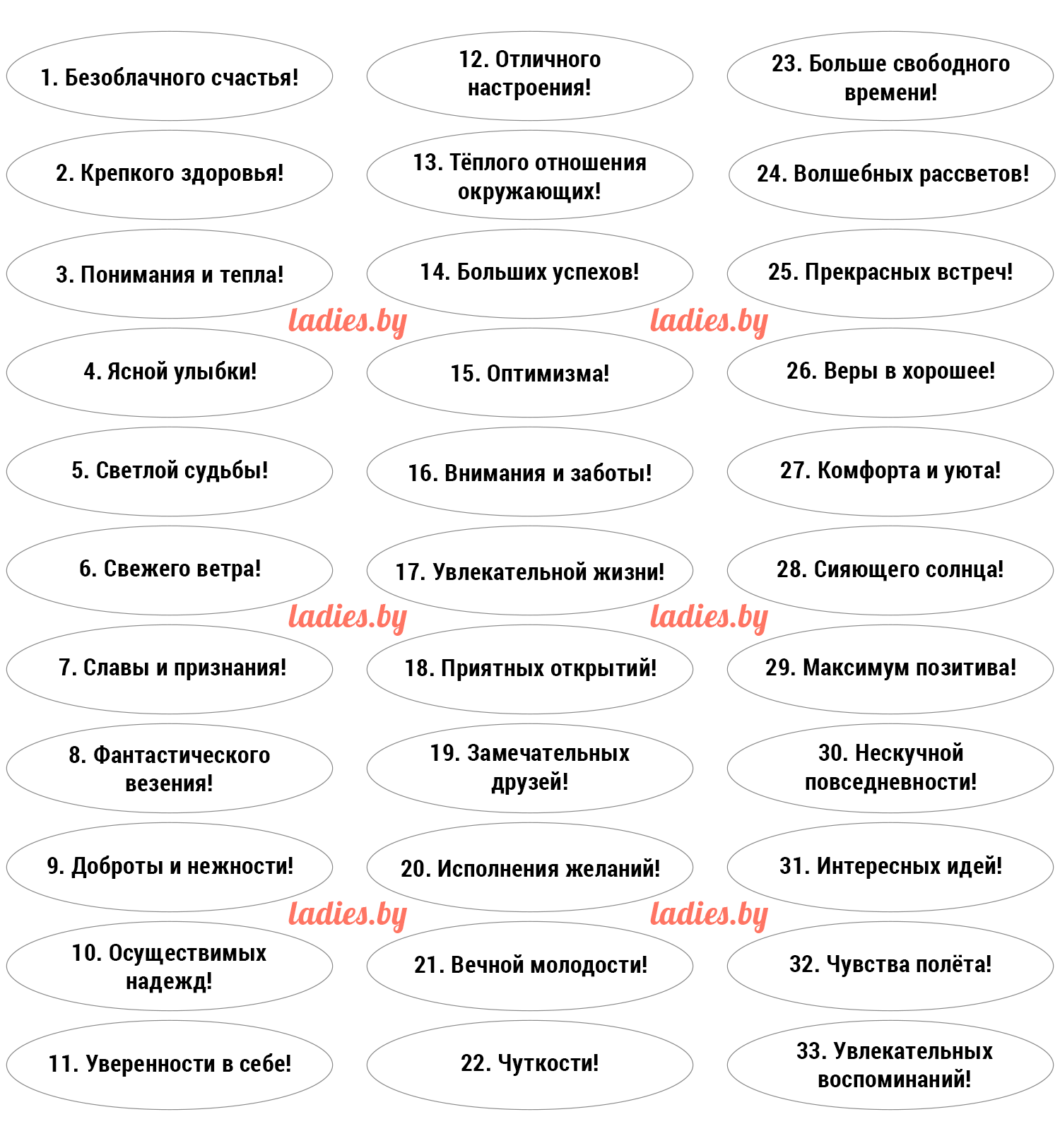 90. Желания идти вперёд!86. Увлекательного общения! 81. Душевной красоты!дней! 73. Возможности почаще расслабиться! 68. Успехов в работе!63. Исполнения всех желаний!59. Важных и желанных 55. Бодрости духа! 50. Красивых минут!46. Кругосветных путешествий! 42. Лёгкого отношения к 38. Интересных бесед! 32. Чувства полёта! 27. Комфорта и уюта! 22. Чуткости! 7. Увлекательной жизни!12. Отличного настроения!