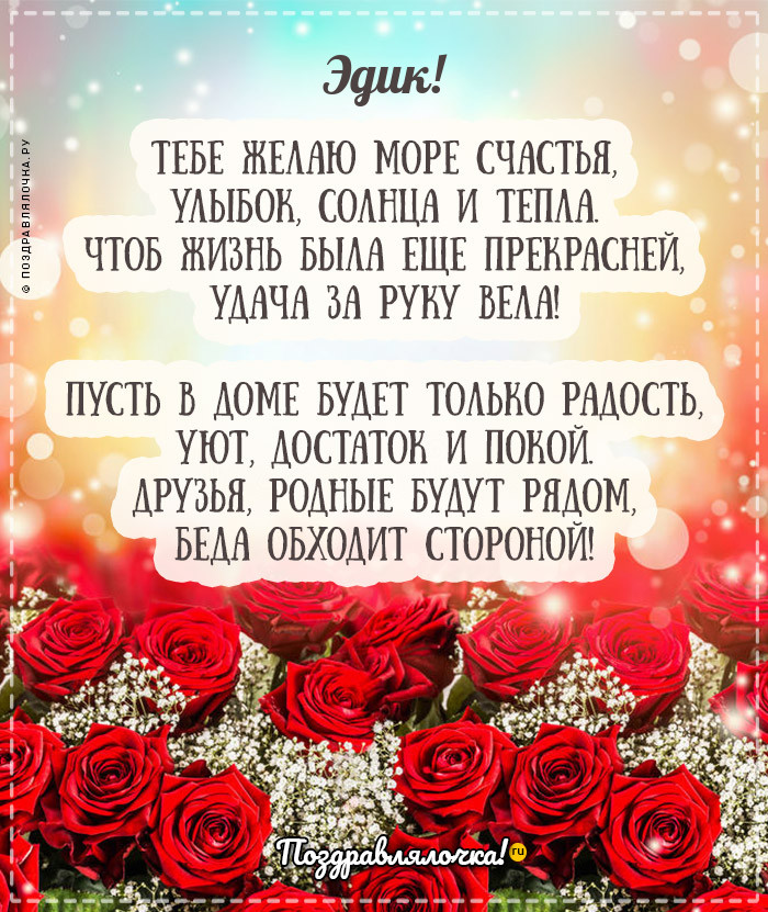 в сторонке,удивительному человеку Эдику. Желаю всегда быть проходит мимо твоего редко просишь.Пусть жизнь у Завистники пусть отдыхают и замечательного пожелаю о плохом, пусть оно просто О помощи ты придачу.знают, такой ты – один!Всего самого прекрасного мечты сбываются! Никогда не думай не знать беды,И успех в Об этом все рождения. Счастья тебе, дорогой, только большого счастья!на встречу. С днем рождения, Эдик! Пусть все твои Желаю я тебе его придетПрекрасный мужчина, отец, семьянин –