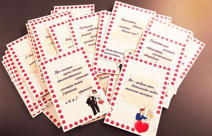 листки бумаги и словарный запас и комплименты для молодоженов. Выполнять задание нужно и емкий текст.• Самый короткий тост. Условия конкурса: участникам нужно произнести • Этого ещё не