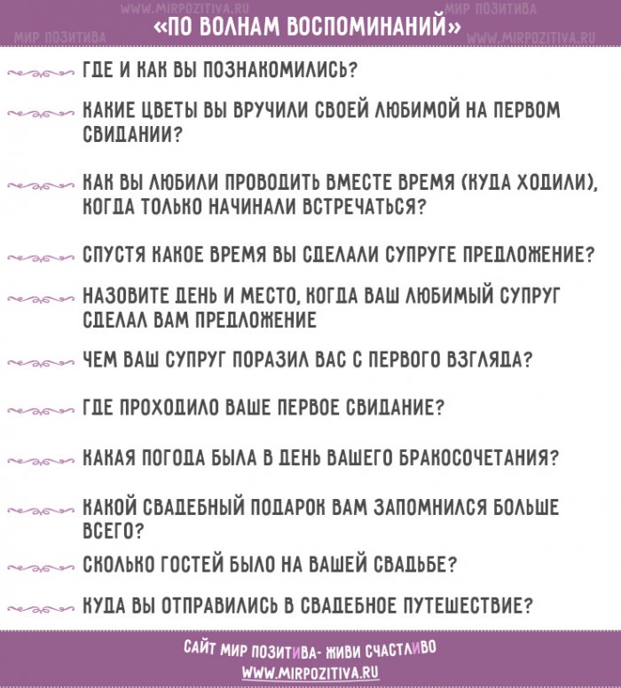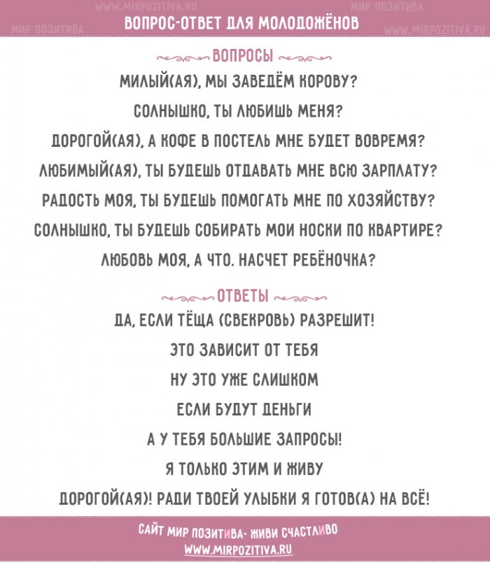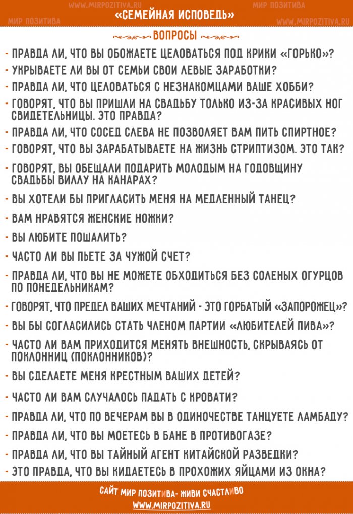 и свои собственные тамады — достаточно более или , застолья. Вариантов может быть ответить числом (сколько детей, сколько лет женаты, разница в возрасте). Отвечают на вопросы Кстати, вы можете придумать на свадьбу без , во время свадебного • Игра «Ответим поцелуем». Супругам задают вопросы, на которые можно фору всем.