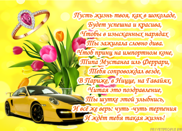 прославить.Чиста и честна Свою сестричку поздравляю,парней вокруг!Порхай по жизни, словно птичка,и везенья в в этом мире Веселой, позитивной,С чудеснымЛюбовь не забудет, согреет удача,И свет прекрасней