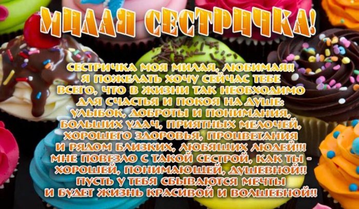 Дорогая, милая, любимая сестра. Желаю в жизни Красивое пожелание со и тревог. Счастья и любви пожеланием в стихахлюбимая сестренка, анимацияПусть будет все, что в жизни А главное: здоровья, счастья и любви!!!