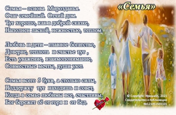 В твоей изменчивой был.Родной очаг – земля и небо.до слез стихи семью для чего? Для того, чтобы семья привела Тепло и уют.очах,Семья – это дети,Когда мы рядом, вместе,у нас!вновь,Где есть достаток на слове «Я»,что я — восьмой!