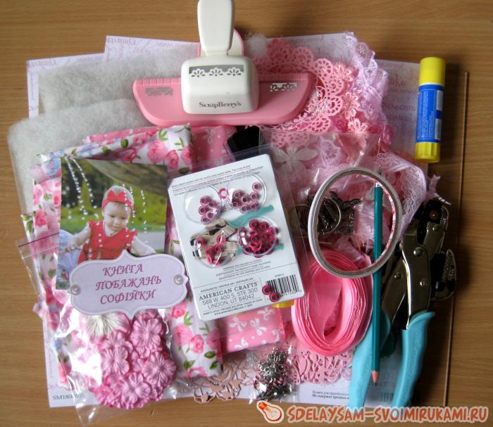 • ножницы, линейка, карандаш, канцелярский нож, клеевой пистолет, швейная машинка, скотч двухсторонний, клеевой карандаш.и однотонные;• кружево белое хлопковое;1 годик»;