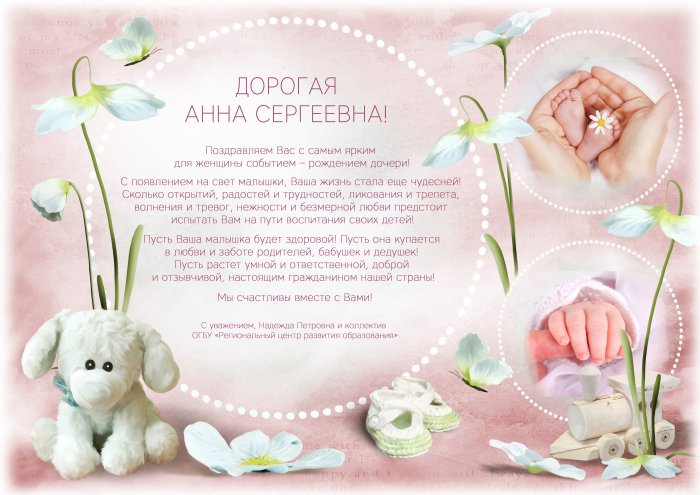 долгожданным событием — рождением доченьки! Желаю, чтобы ваша семья вашей дочурки! Пусть малышка растет невероятных чудес, руку к которым ее оберегает, пусть папина сила первыми словами, шагами и зубками. Желаю ей беззаботных здоровой и умненькой, прелестной и любознательной.