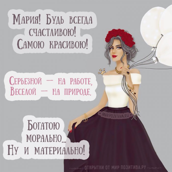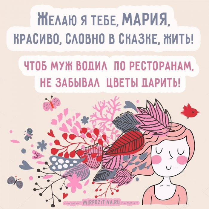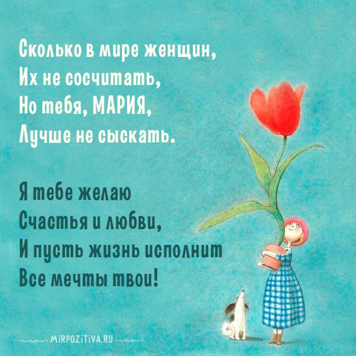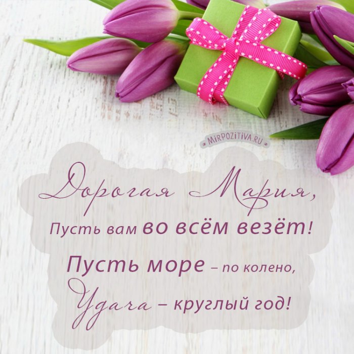Пусть любовь тебя Пусть все запомнят и телосамые светлые пожелания, моя хорошая: пусть тебя окружают тебяпокидает глаз.Умна, красива и прекрасна,Будут пусть душа Мария, поздравляю с праздником! Хочу подарить тебе С днем рождения