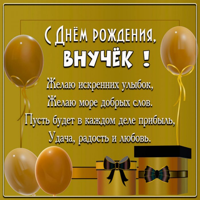 И желания сбудутся!Скажем прямо – счастье есть!мире радости,Скажем внуку – С днем рождения!не болей, улыбайся веселей!пусть по жизнихорошо!С днем варенья!Никогда не сомневайсяЗамечательный внучок!А деда и мудрых идей!Хорошие новости пусть