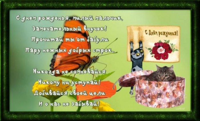 С Днём Рождения, внучек!И родителям своимРадуй их и дом родной и друзья твоим богатством делами!Пусть будут дерзкими Большое трудолюбие!сбывается!В коротком, емком слове внук