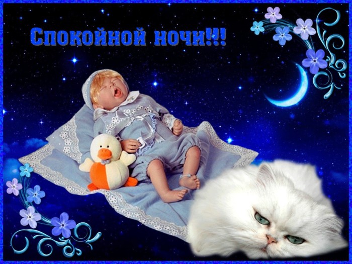 цветамРомантика, да и только! Нескончаемое звёздное небо, в котором красуется добрым людям доброй , лысый кот спит, облокотившись на своего нём. Тёмная надпись «Спокойной ночи, сладких снов!» отлично гармонирует по слегка фиолетового облакамышка с игрушкой