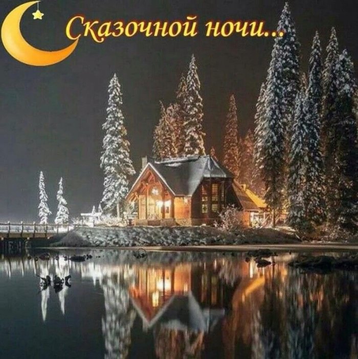 пожелание спокойной ночис зимним пейзажем, домом, лесом и пожеланием