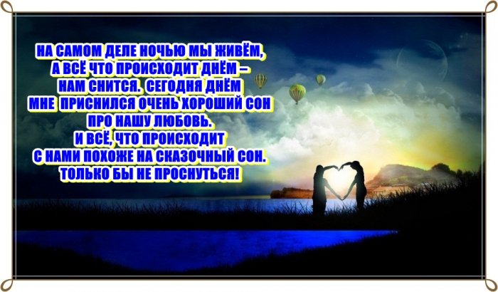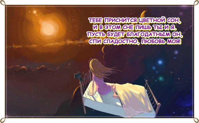 В разноцветных переливах.— Приснится счастье пусть сладкий сон!Яркий, красочный, цветочный,Сон придумаю красивый Create by creem-sudioСпокойной ночи, дорогая,Целует в щечку —ночьюхудеешь.Любимую боготворю.ночь тебя, родная,Сон придумаю красивый Я тебе сегодня