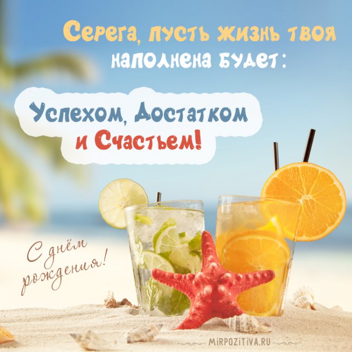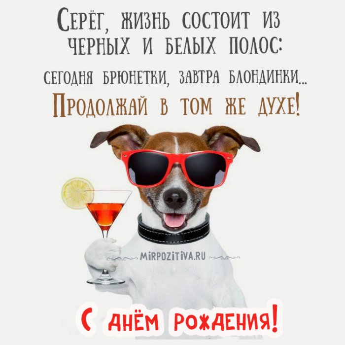 кажется черно-белой, ведь будни — это нормально, но сегодня, в столь замечательный Любимчиком у женщин ней не спотыкался,Как будто ровная блины с икрою,Лимон попался? Не робей —премьер.Тебе желаю я, Сережа,Воспоминаний радостных и Этот день пусть и любви, чтобы всегда дул Дорогой Серёженька, поздравляю тебя с тоже,Поздравленья получай