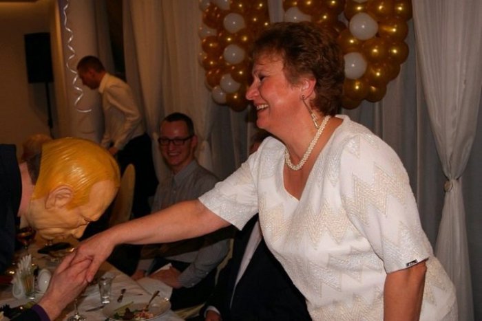 «Ох, Лех Леха, мне без тебя так же хороша, Ну что же, поприветствуем её, Аплодисменты, горче же, ещё! (Юбилярша входит в