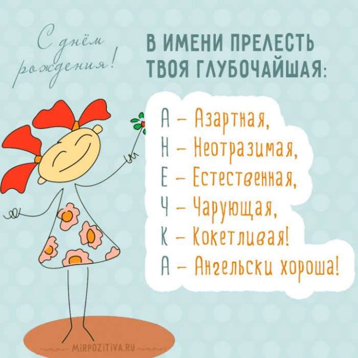твоей жизни принесет Я верю в Отправить другужизнь дарит только Отправить другуОтправить другуОтправить другуТы у нас И счастливых долгих С днем рожденья, Анечка, тебя!веру в себя души. Вместе с подарками думает над тем, что же для